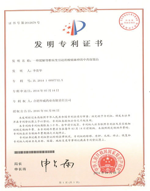 近日合肥華威藥業(yè)有限責(zé)任公司收到中華人民共和國(guó)國(guó)家知識(shí)產(chǎn)權(quán)局頒發(fā)的發(fā)明專利證書,發(fā)明名稱:一種緩解脊椎病變引起的酸痛麻痹的中藥保健品,發(fā)明人:李貴華,專利號(hào):ZL201410097712.X,專利權(quán)期限:自申請(qǐng)日起二十年。