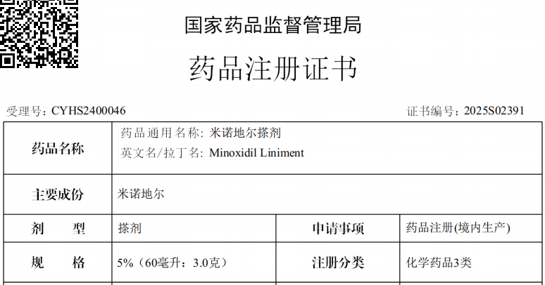 2025年7月30日,合肥華威藥業(yè)收到國家藥品監(jiān)督管理局核準簽發(fā)的米諾地爾搽劑《藥品注冊證書》,批準我司按照化藥3類申報的米諾地爾搽劑2%(60ml:1.2g)和5%(60ml:3.0g)兩個規(guī)格上市,批準文號為:國藥準字H20255037、H20255038,本次獲批產(chǎn)品已獲得OTC認可,可自行評估,直接在藥店購買。